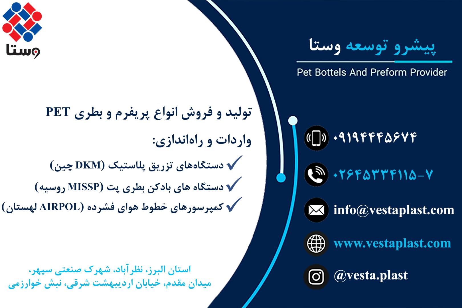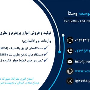 شرکت پیشرو توسعه وستا یکی از معتبرترین نام های تجاری در صنعت بسته بندی در زمینه مواد غذایی، صنایع لبنی، شوینده و سایر موارد مشابه میباشد و با استفاده از ماشین آلات، قالبها و تجهیزات پیشرفته و به روز دنیا و همچنین با بهره گیری از دانش و تجربه متخصصین خود هم اکنون یکی از تولیدکنندگان پیشرو و موفق در زمینه تولید انواع پریفرم PET، و بطری در اوزان و دهانه های گوناگون بوده که به مشتریان صاحب نام خود در داخل و خارج از کشور بفروش می رساند. همچنین شرکت پیشرو توسعه وستا یکی از معتبرترین نام های تجاری در زمینه واردات ماشین آلات تولید بطری و تزریق پلاستیک در ایران و کشورهای همسایه میباشد.